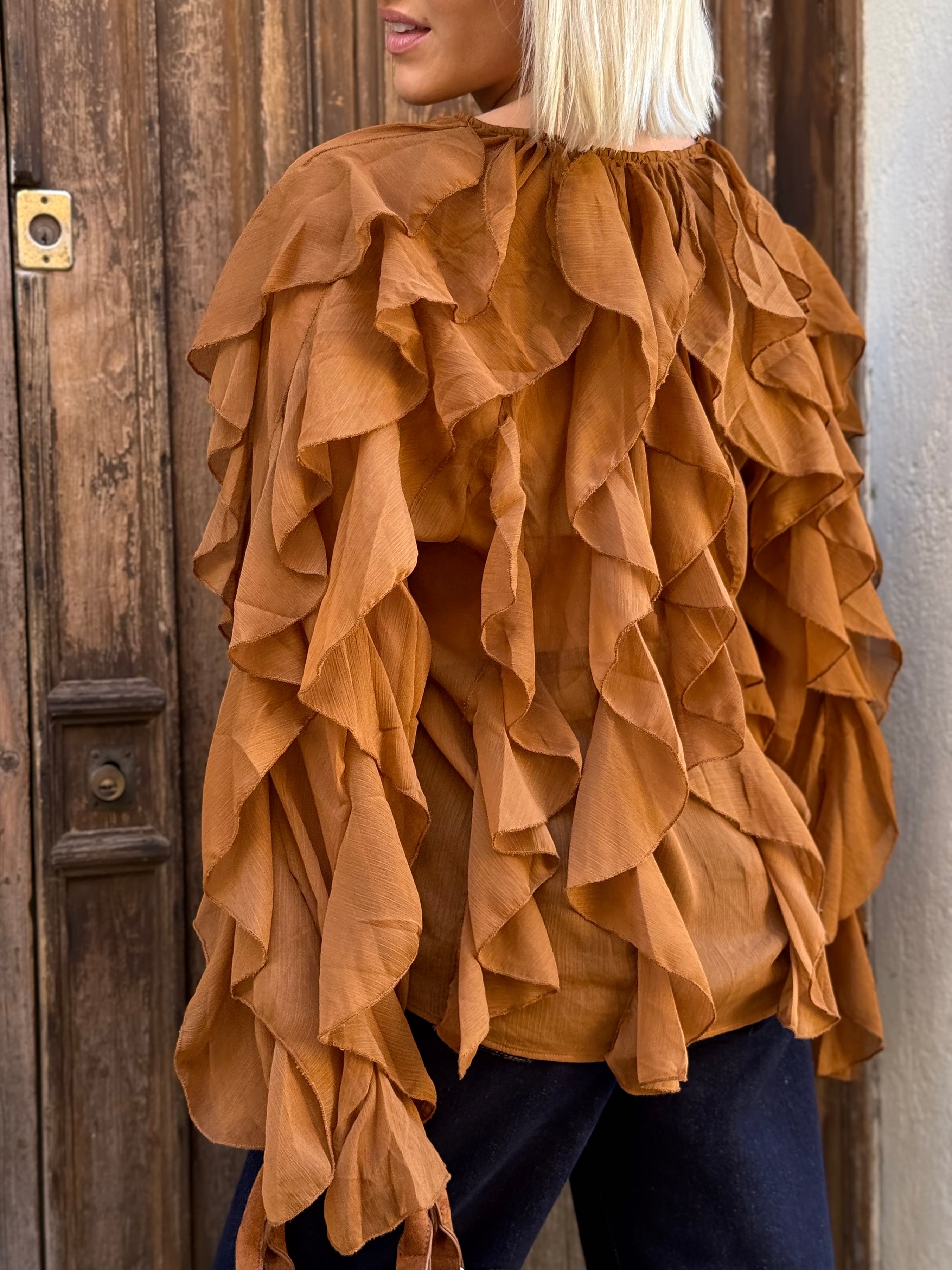 Apportez une touche élégante et féminine à vos looks avec cette blouse bohème chic. Sa coupe droite et ses volants délicats sur le devant lui donnent un charme raffiné, parfait aussi bien pour un look casual que sophistiqué.
