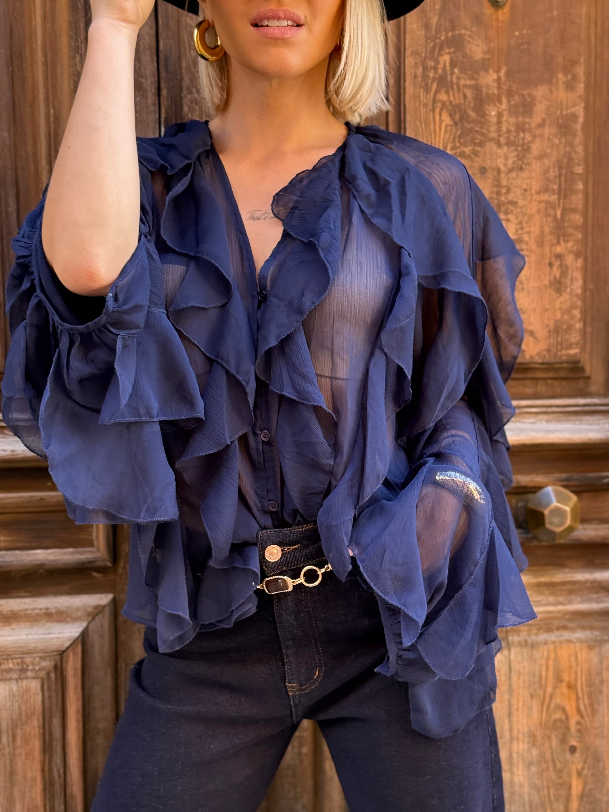 Apportez une touche élégante et féminine à vos looks avec cette blouse bohème chic. Sa coupe droite et ses volants délicats sur le devant lui donnent un charme raffiné, parfait aussi bien pour un look casual que sophistiqué.