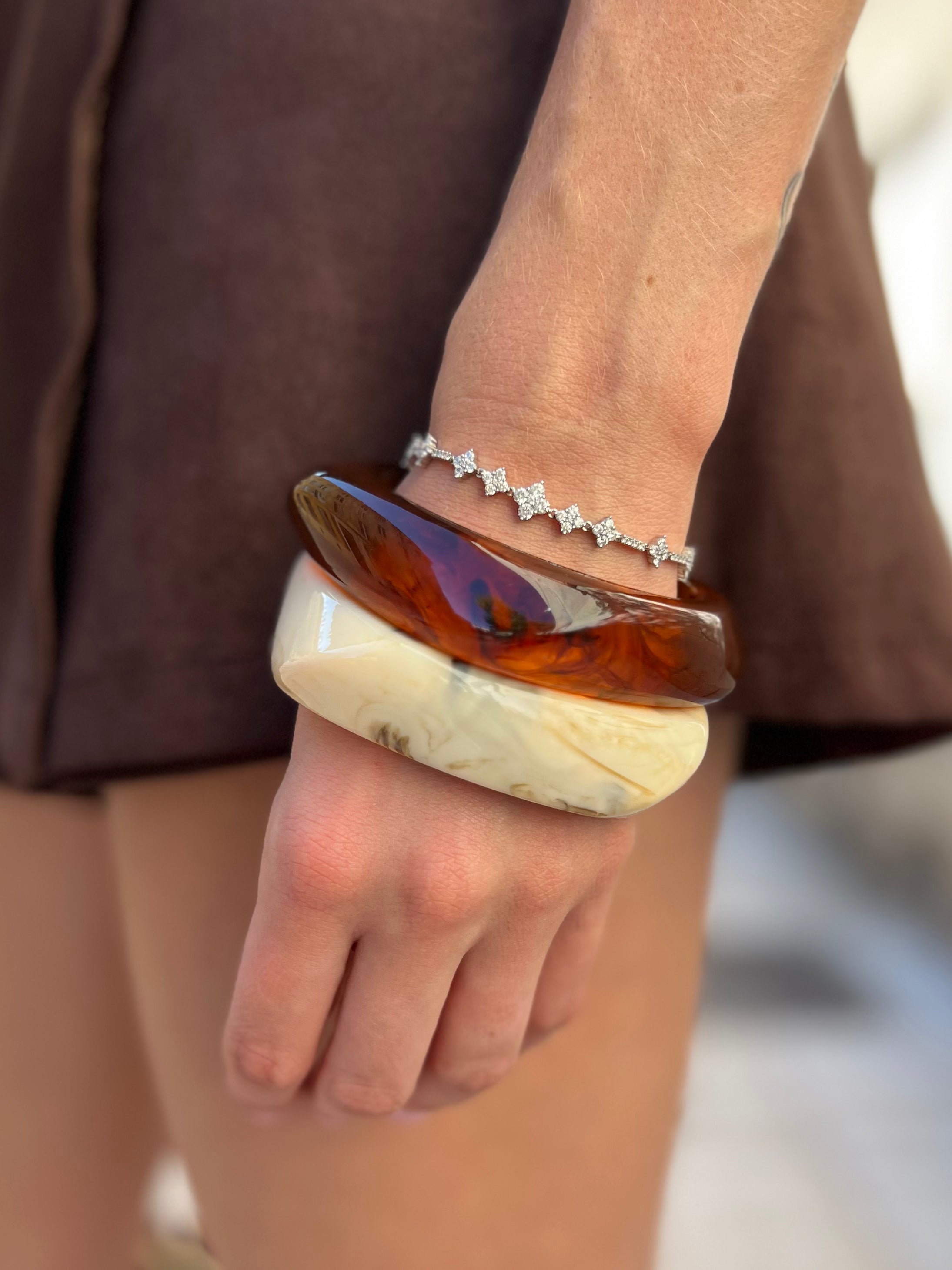 Le Bracelet Ivory est la touche tendance qui sublime vos looks au quotidien. Décliné en ivoire, ambre, bordeaux et vert, il se porte aussi bien seul qu’en accumulation pour un style affirmé. Sa finition en résine brillante lui apporte un côté moderne et raffiné, facile à assortir à toutes vos tenues.