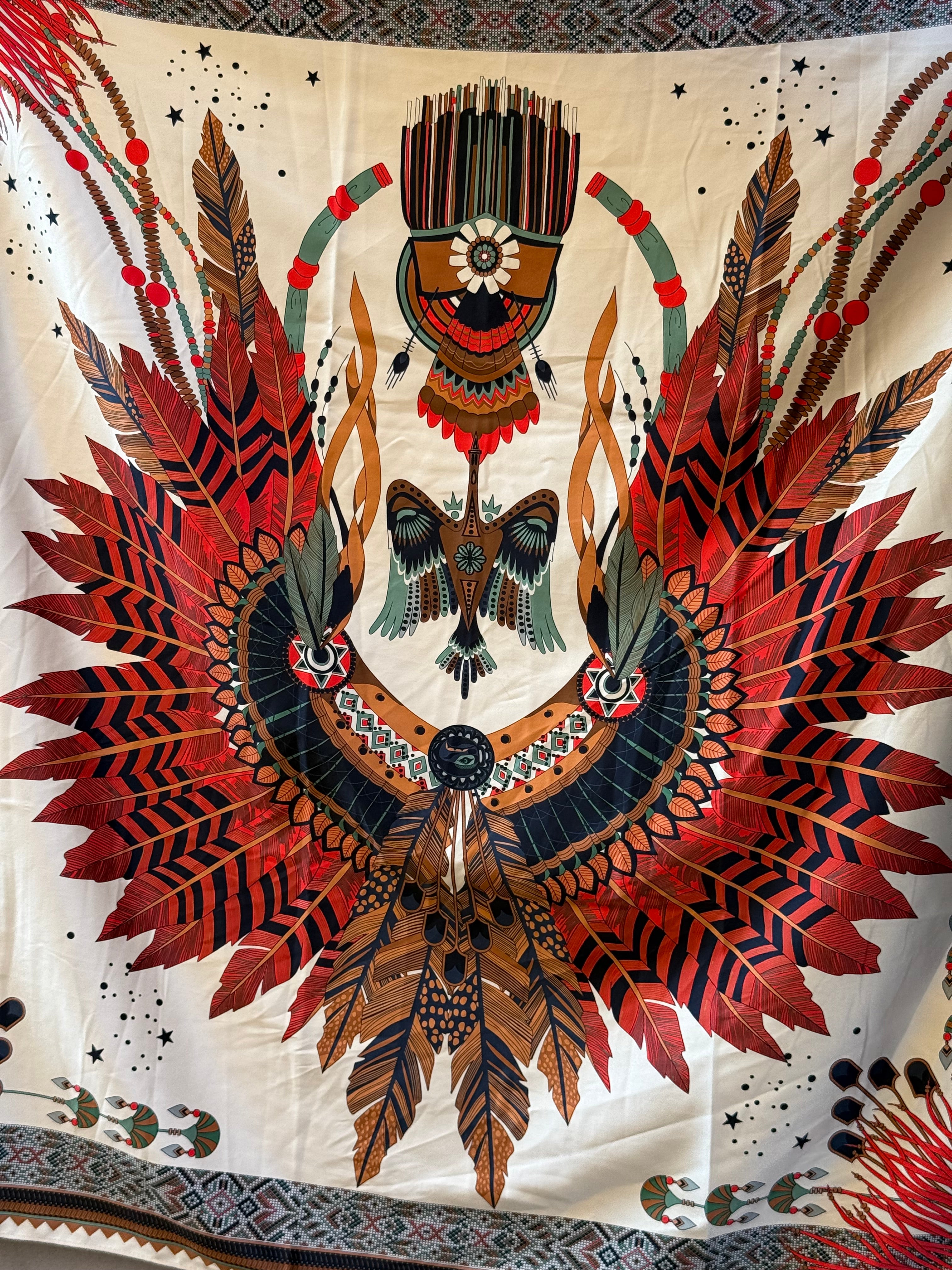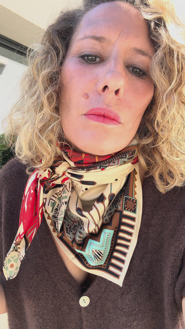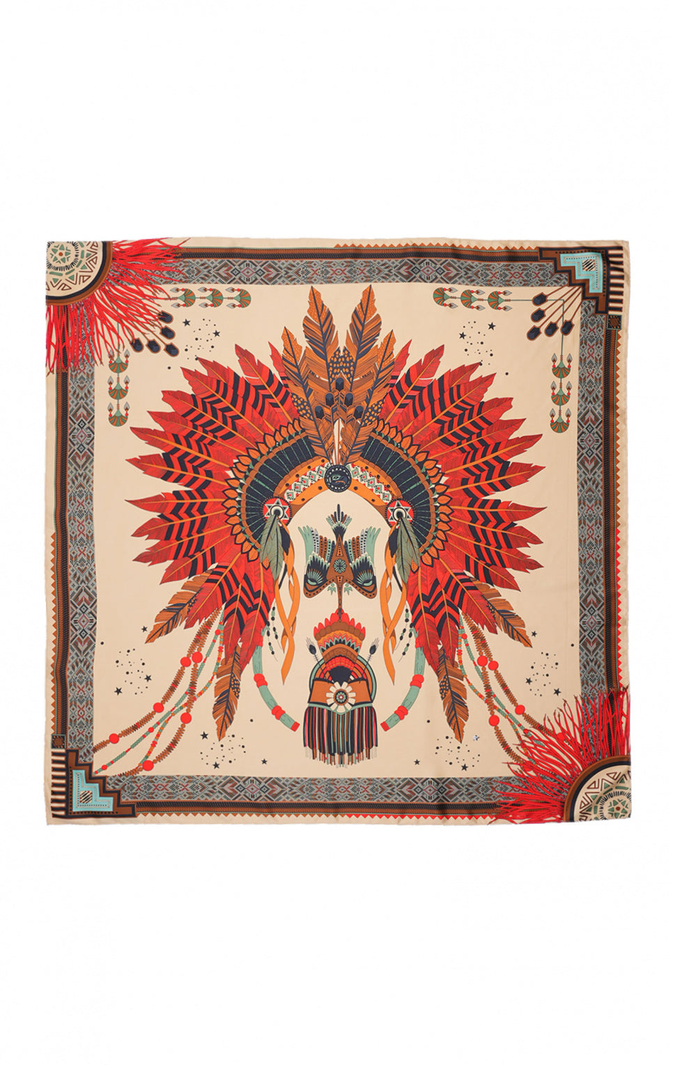 Cet hiver, l’imprimé Nouveau Western se pare, en son centre, d’une somptueuse et imposante coiffe d’indien réhaussée de symboles tribaux sur chacun des coins du foulard. Les motifs de nos bracelets brésiliens encadrent élégamment le foulard. Ils se mêlent aux petits symboles emblématiques de la marque, tels que les étoiles, les plumes ou les bordures signature. Versatile, il se porte aussi bien en foulard qu’en paréo selon le format. Nouez-le autour du cou, de la taille, en turban, ou même en accessoire chic sur votre sac.