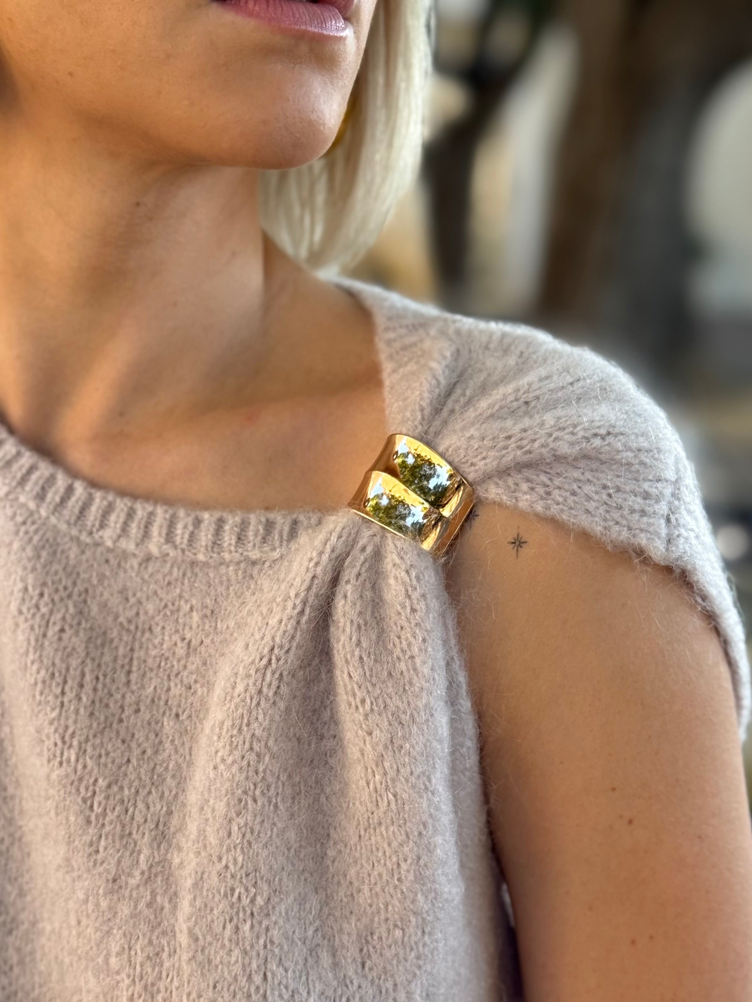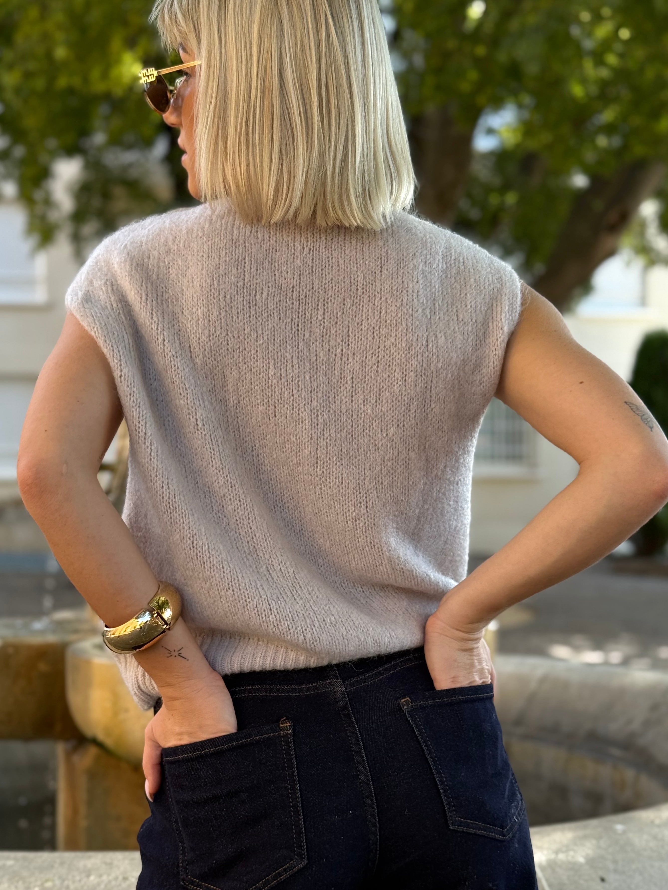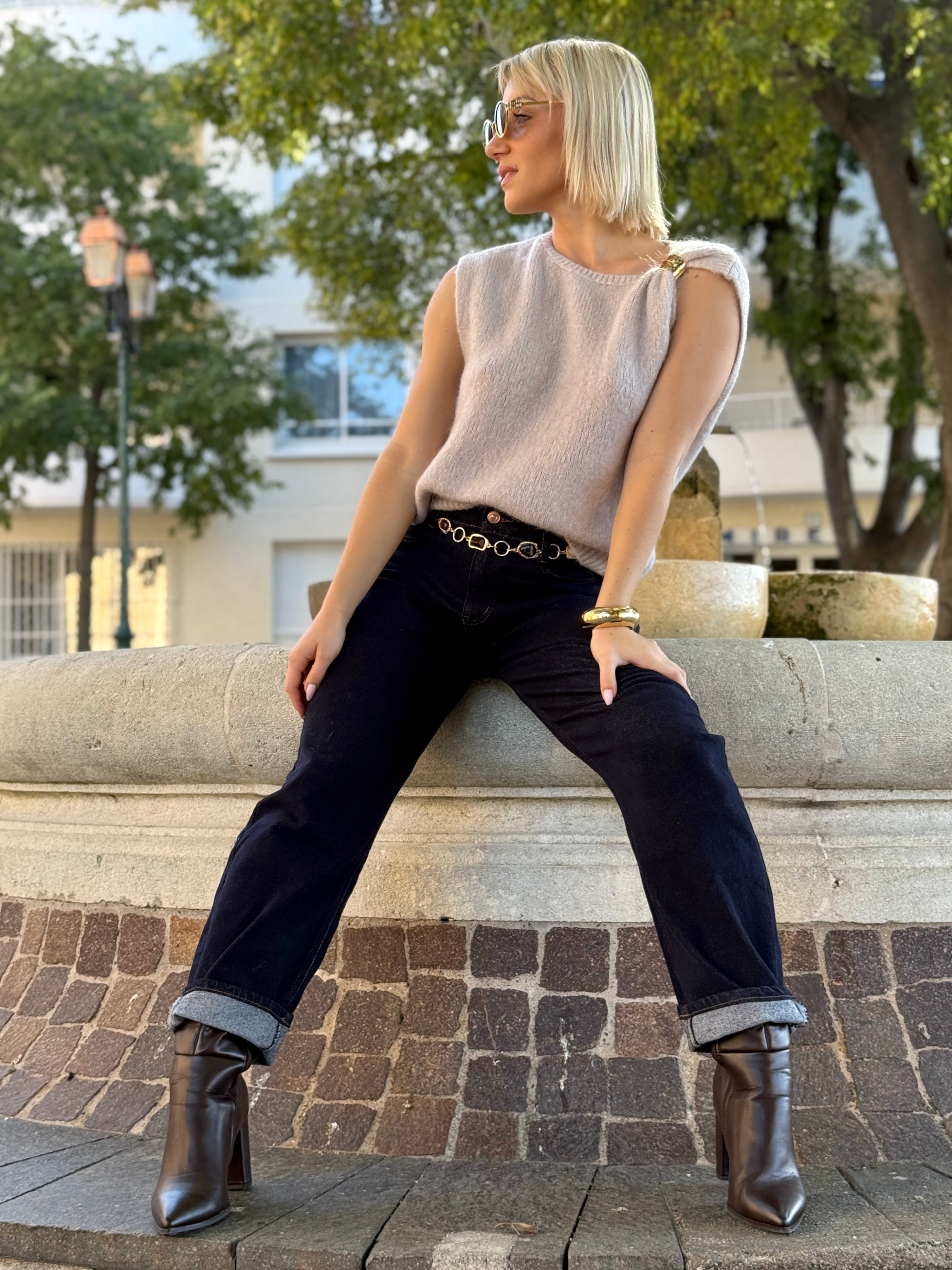 Apportez élégance et modernité à vos tenues avec le pull Lili sans manches. La boucle dorée sur l’épaule gauche apporte une touche sophistiquée et chic, tandis que sa coupe confortable et sa matière douce en font un essentiel du dressing, facile à associer avec toutes vos tenues.