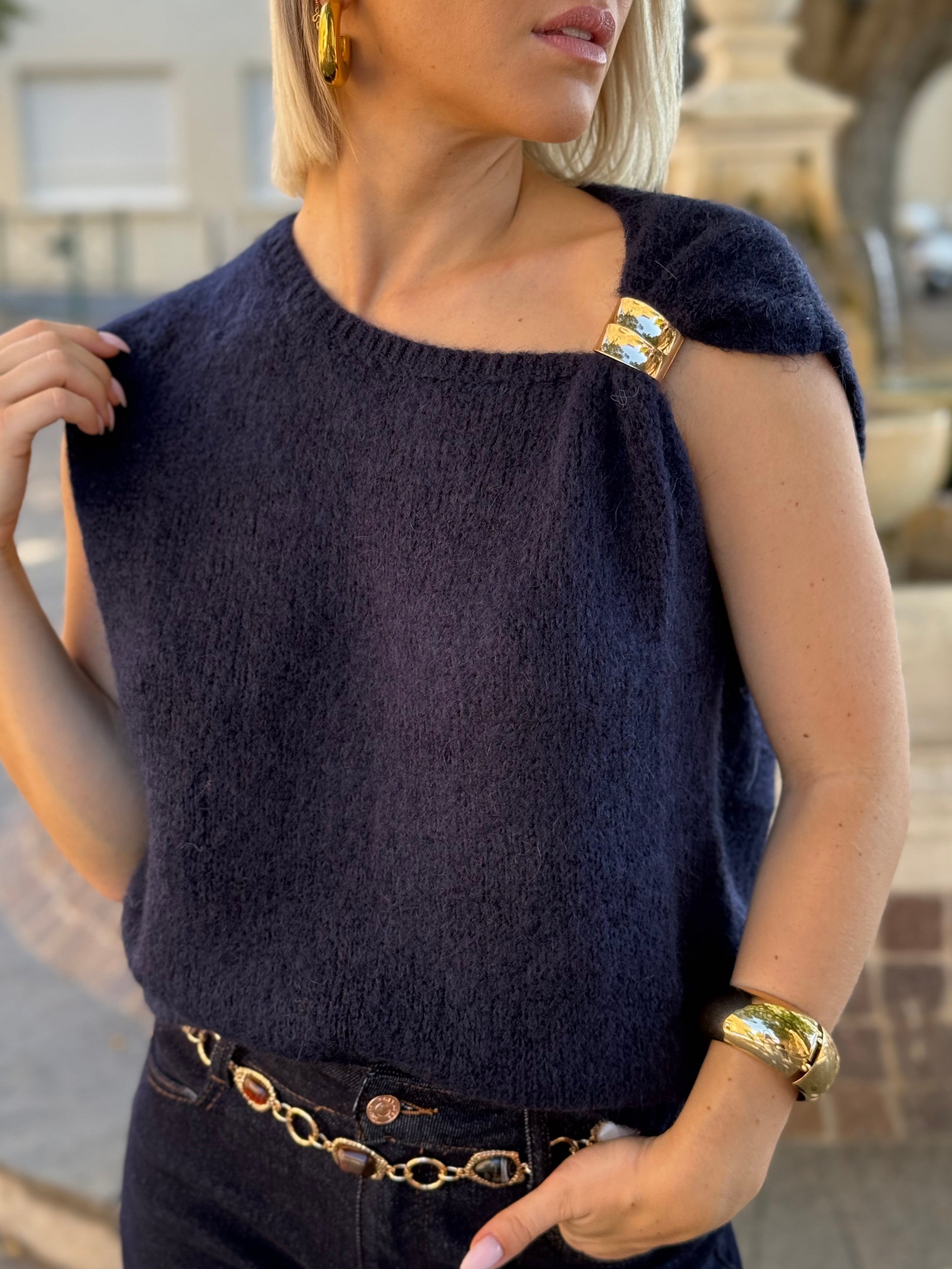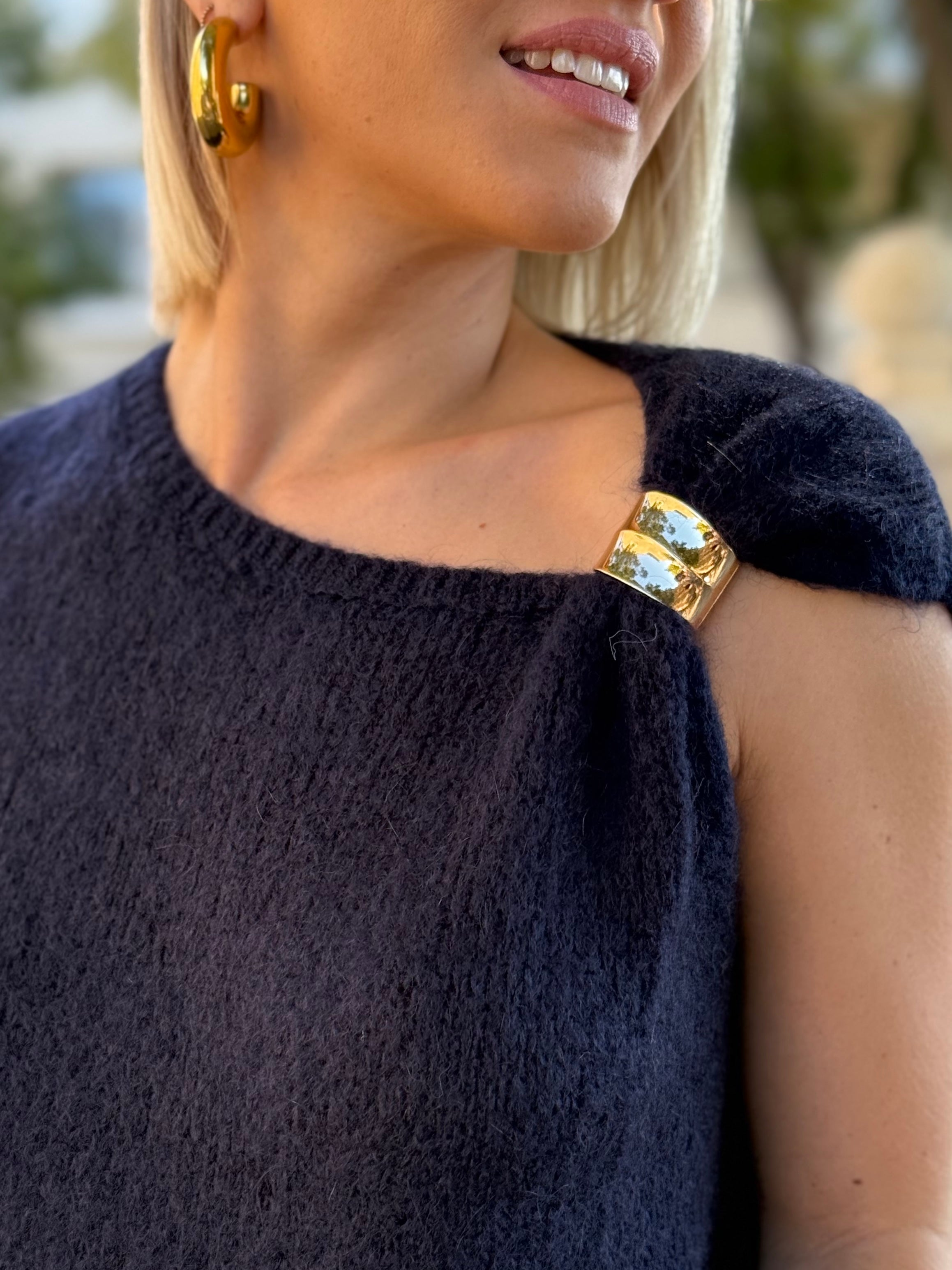 Apportez élégance et modernité à vos tenues avec le pull Lili sans manches. La boucle dorée sur l’épaule gauche apporte une touche sophistiquée et chic, tandis que sa coupe confortable et sa matière douce en font un essentiel du dressing, facile à associer avec toutes vos tenues.