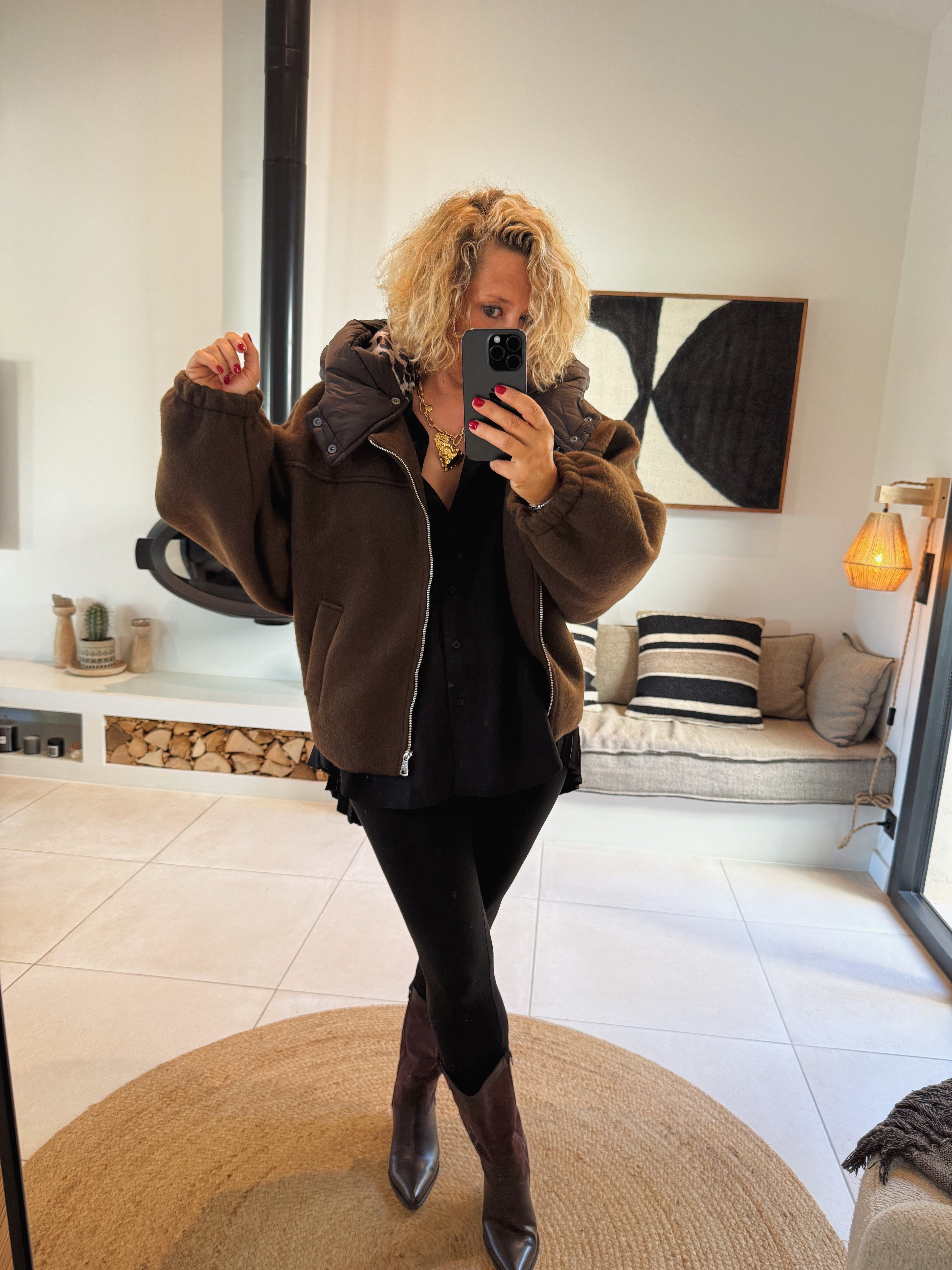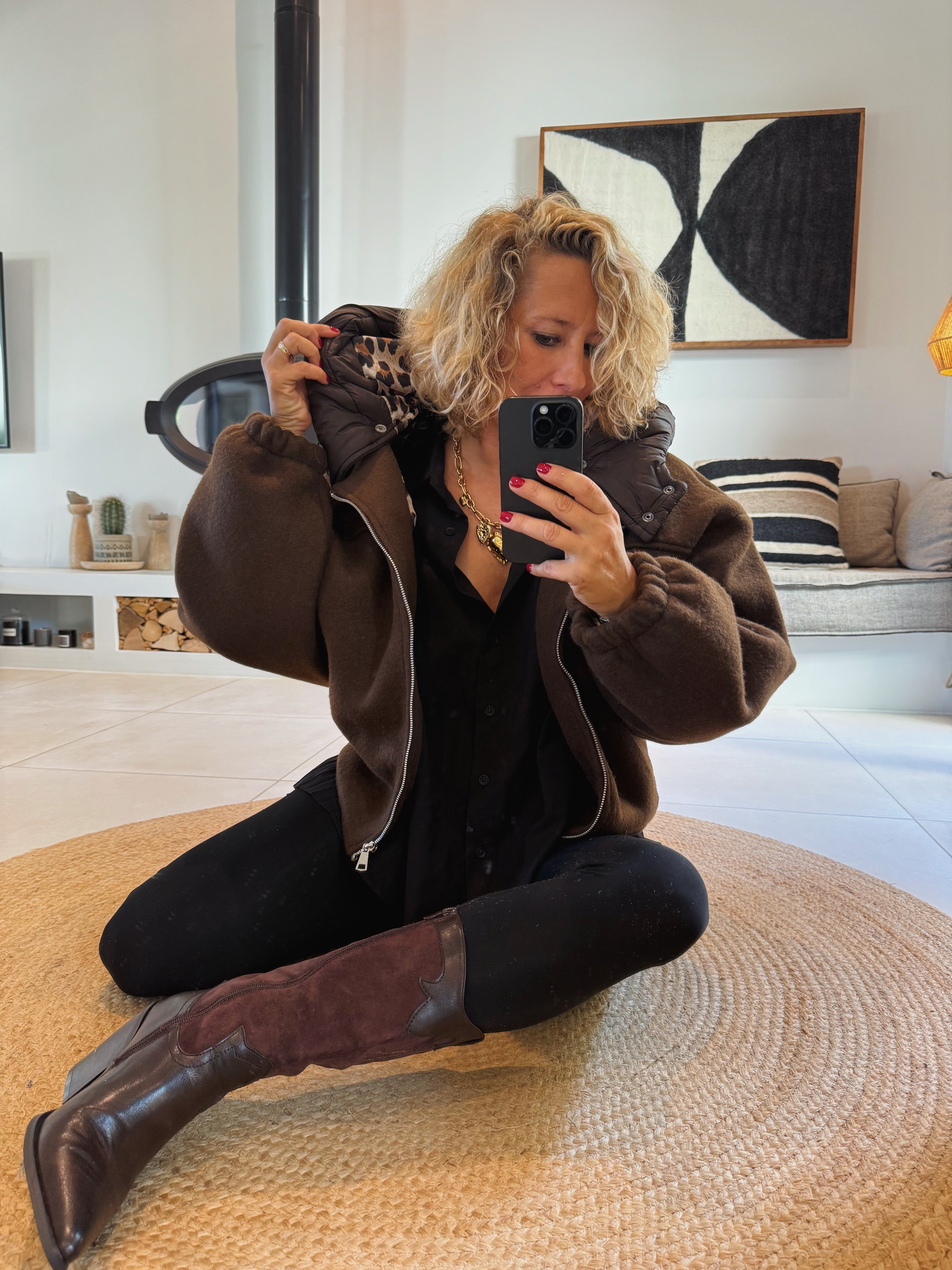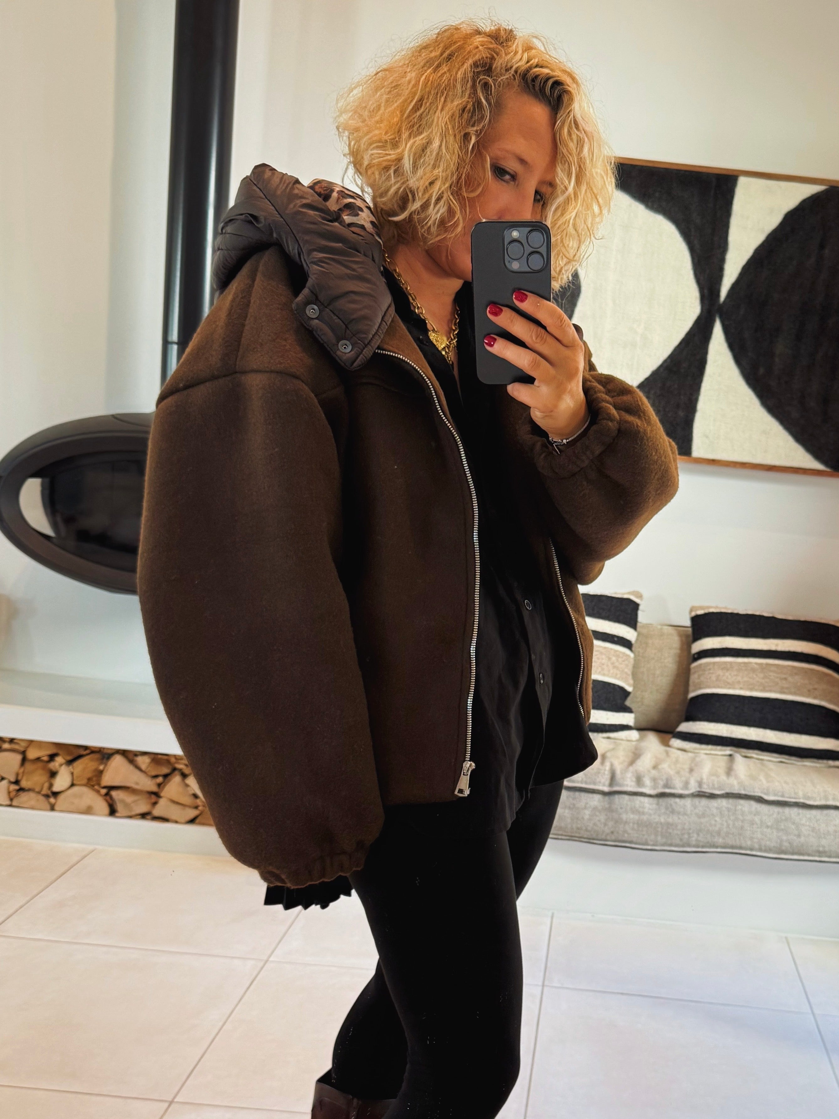 Découvrez la Veste PAULETTE Chocolat, alliant confort et style avec sa matière douce et chaude. Sa capuche amovible offre polyvalence pour s’adapter à toutes les envies, tandis que l’intérieur imprimé léopard apporte une touche originale et tendance. Parfaite pour rester au chaud tout en affichant une allure décontractée et unique.