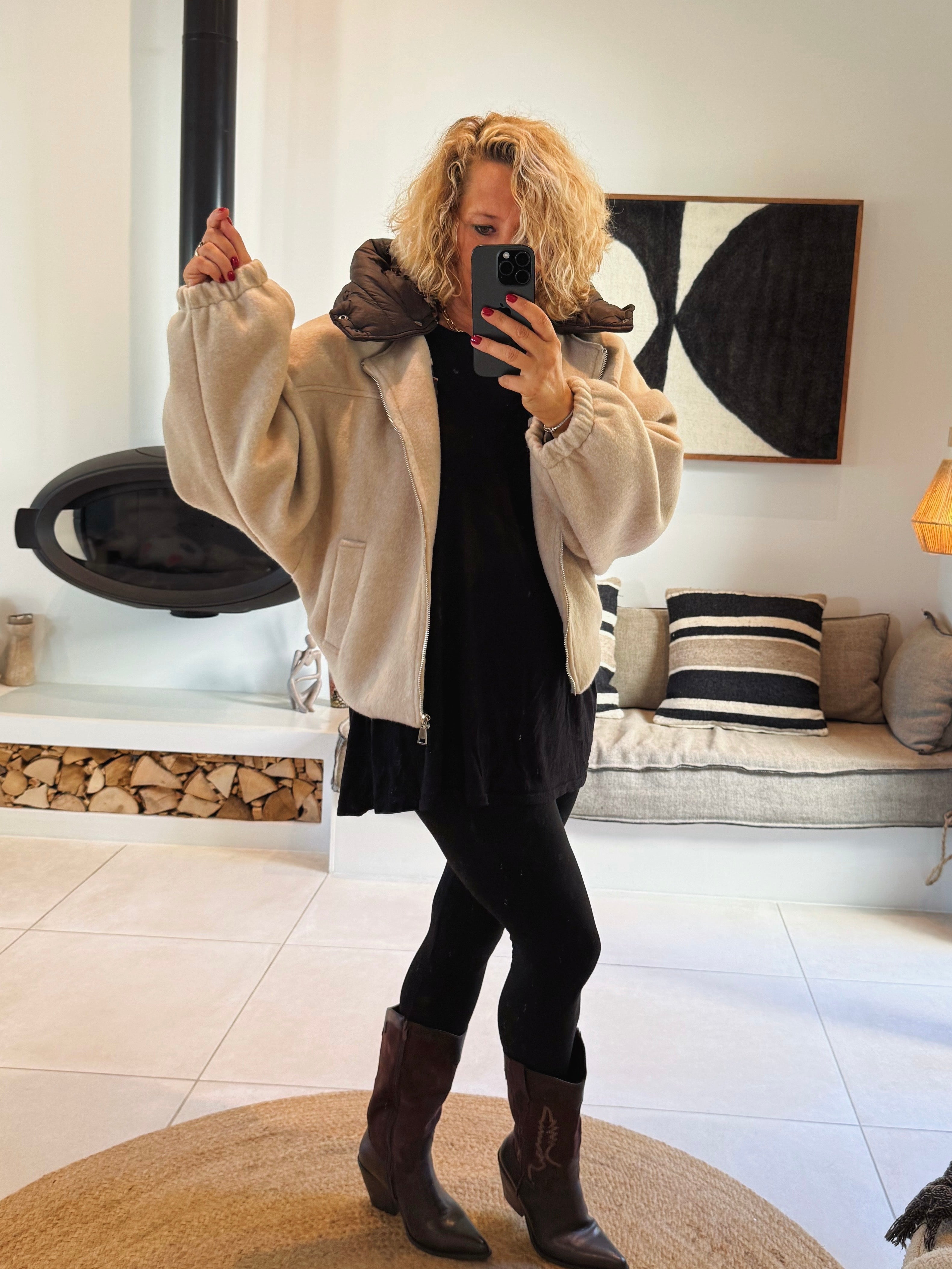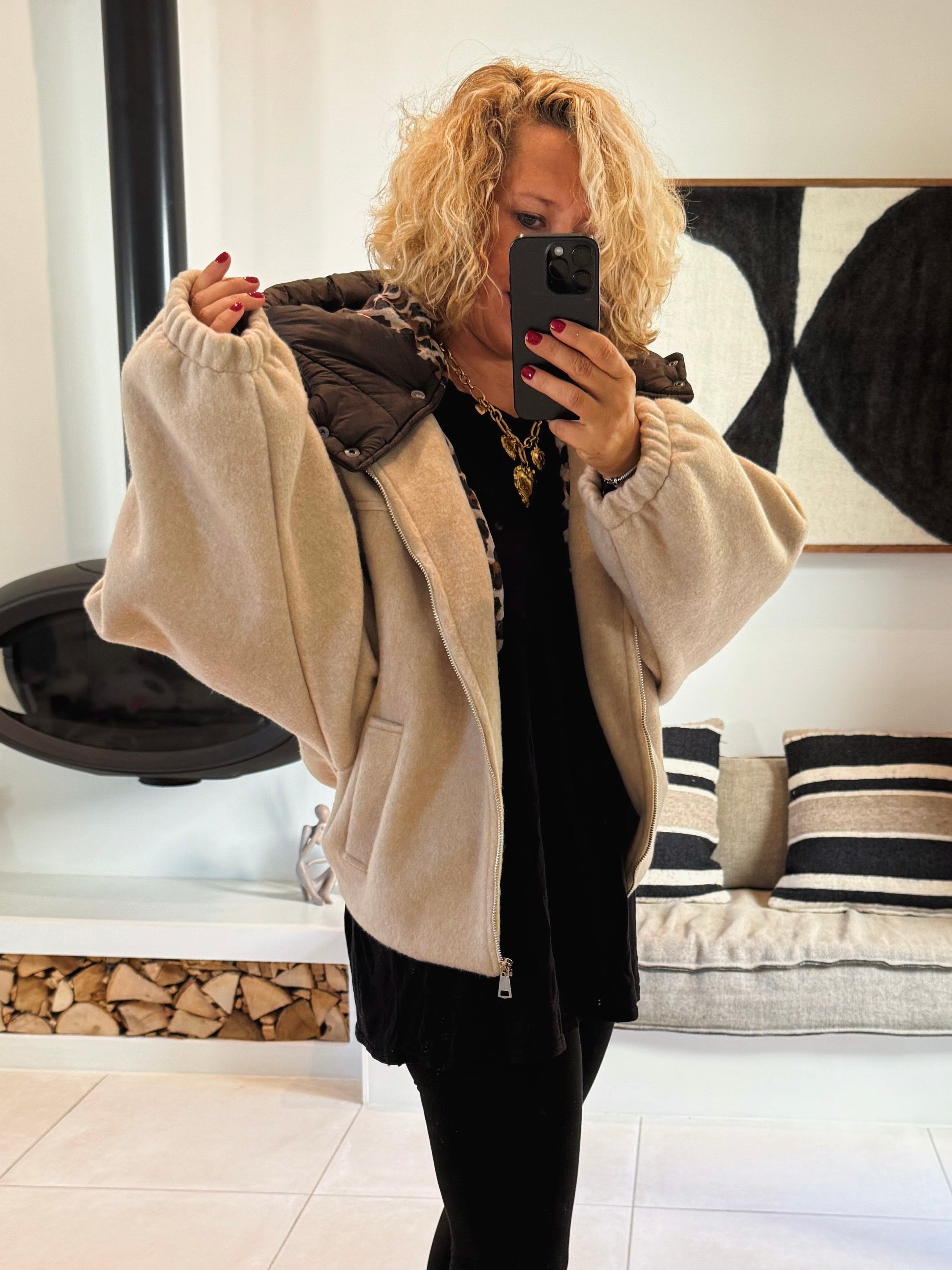 Découvrez la Veste PAULETTE Crème, alliant confort et style avec sa matière douce et chaude. Sa capuche amovible offre polyvalence pour s’adapter à toutes les envies, tandis que l’intérieur imprimé léopard apporte une touche originale et tendance. Parfaite pour rester au chaud tout en affichant une allure décontractée et unique.